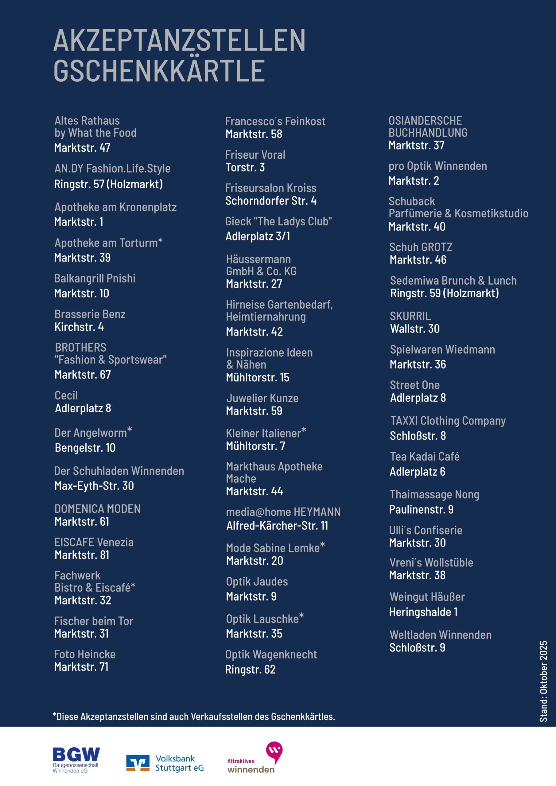 Am 1. Februar 2021 wurde der Winnender Geschenkgutschein aus Papier vom Winnender Gschenkkärtle abgelöst. Im praktischen Checkkartenformat und teileinlösbar in über 40 Winnender Einzelhändler überrascht der Gutschein mit frischem Design und weiteren tollen Extras!