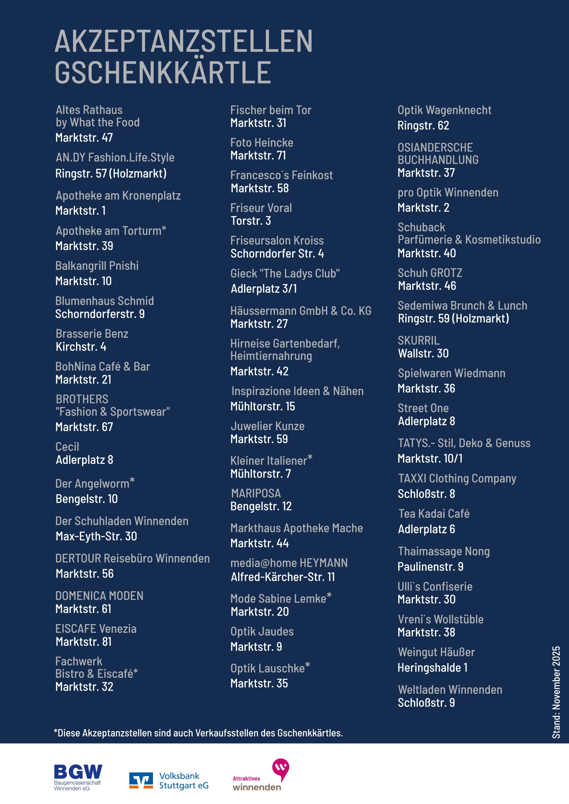 Mit dem Winnender Gschenkkärtle den Liebsten zeigen wie viel sie Ihnen bedeuten. Familie und Freunde bekommen genau das, was sie sich wünschen – denn bei einer Auswahl von über 40 Winnender Fachgeschäften treffen Sie jeden Geschmack. Egal ob Mode, Blumen, Elektronik, Parfum, Pralinen, Kosmetik, Geschenkartikel, Gastronomie, Friseur und vieles mehr – mit dem Winnender Gschenkkärtle bleibt kein Wunsch offen!