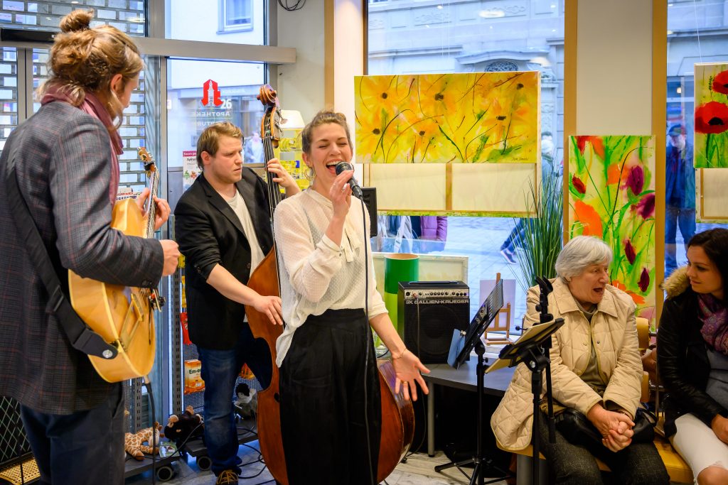 Nicht nur für das Auge war an diesem Abend etwas geboten, auch die Ohren kamen auf Ihre Kosten. An verschiedenen Orten in der Innenstadt spielten an dem Abend insgesamt neun Musikerinnen und Musiker und begleiteten den Abend musikalisch.