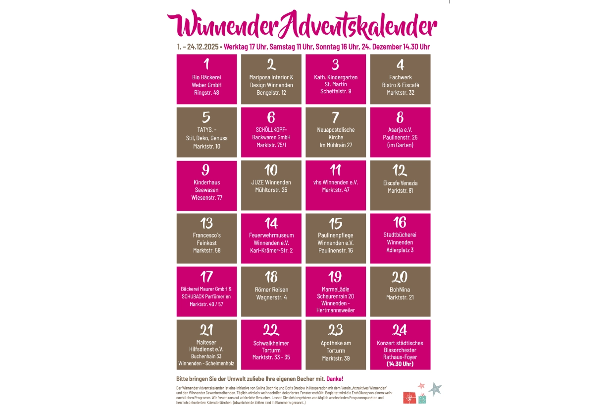 „Türchen auf!“ Der Winnender Adventskalender, der vor elf Jahren ins Leben gerufen wurde, findet auch dieses Jahr wieder statt. In enger Zusammenarbeit mit Selina Bochnig und Doris Bredow sowie den örtlichen Gewerbetreibenden hat sich der Adventskalender zu einem herausragenden Höhepunkt in der Vorweihnachtszeit für Jung und Alt entwickelt.