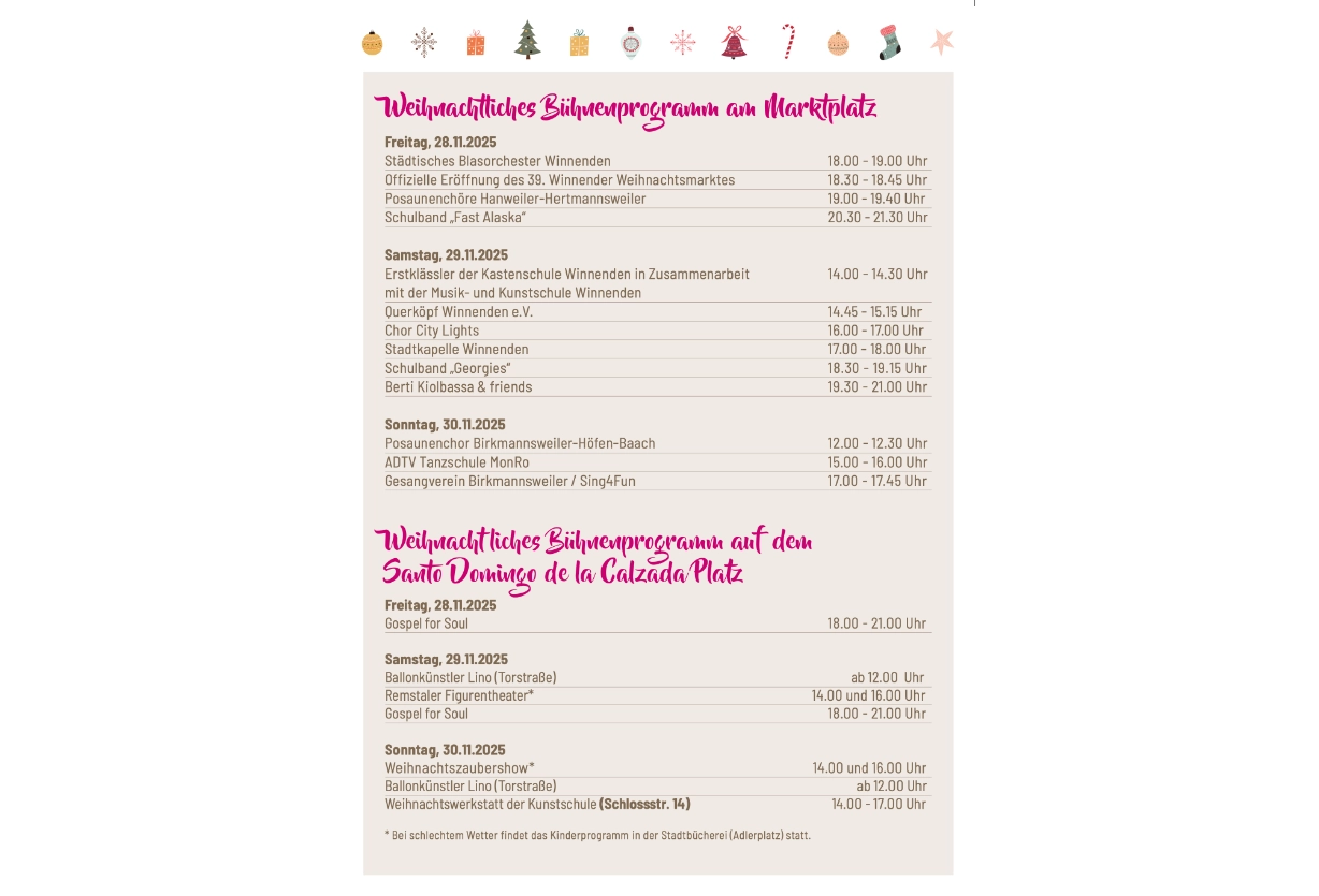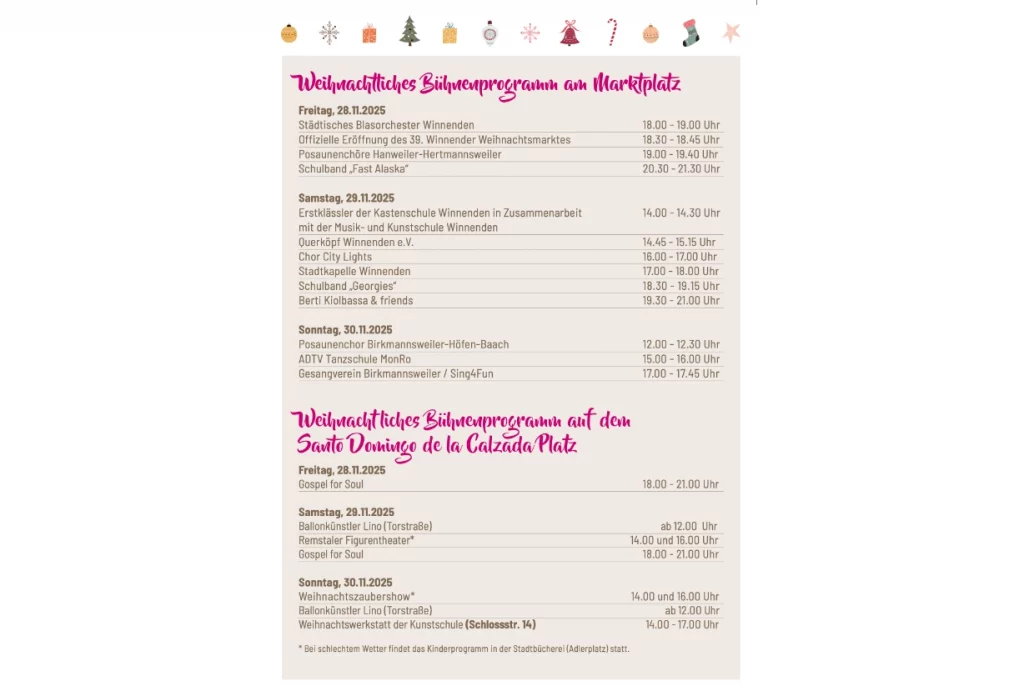 Der Verein „Attraktives Winnenden“ lädt auch in diesem Jahr herzlich zur Winnender Weihnacht in die festlich geschmückte Innenstadt ein. Vom 28. November bis 24. Dezember 2025 verwandelt sich Winnenden in eine stimmungsvolle Weihnachtsstadt und bietet Besucherinnen und Besuchern eine zauberhafte Vorweihnachtszeit voller Lichter, Musik und Begegnung.